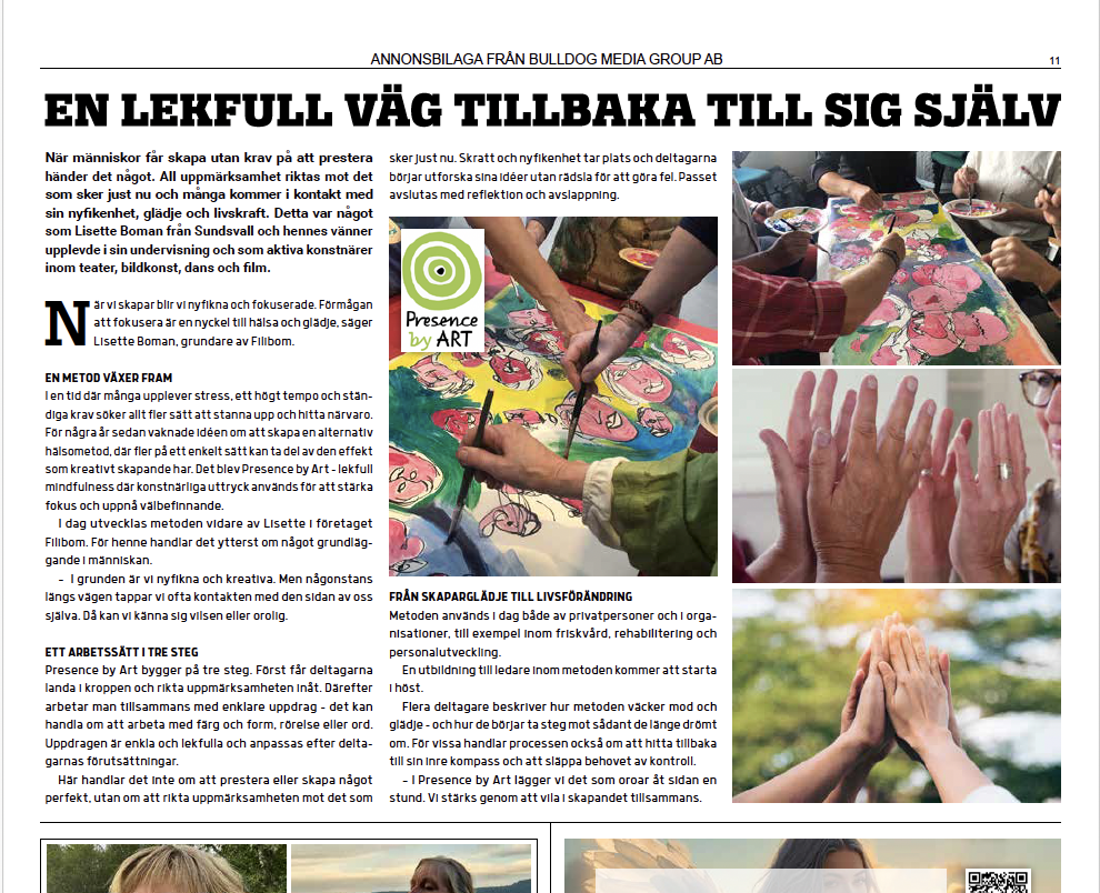 Presence by Art är en lättsam och effektiv hälsometod, där vi använder oss av vår medfödda nyfikenhet och kreativa förmåga för att hitta tillbaka till oss själva och glädjen i livet igen.